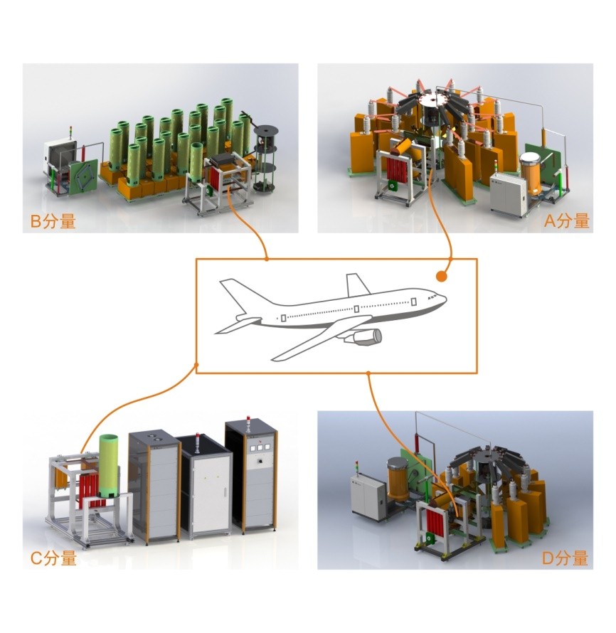 提供雷电直接效应系统设计方案,其中包括雷电冲击电压试验系统、雷电冲击电流试验系统及雷电整机试验系统。雷电冲击电压试验系统满足《GJB3567-1999》、《SAE ARP5412B-2013》、《RTCA DO160G-2010》等标准试验要求,产生标准规定的雷电压A、B、C、D波形,也能够满足《GJB1389A-2005》和《GJB8848-2010》标准中地面电场上升率要求。
